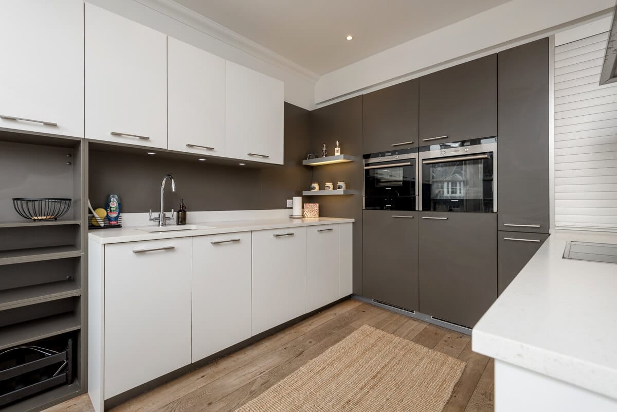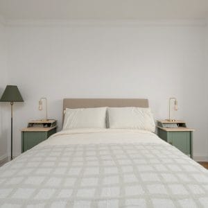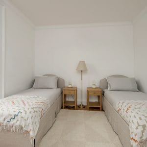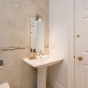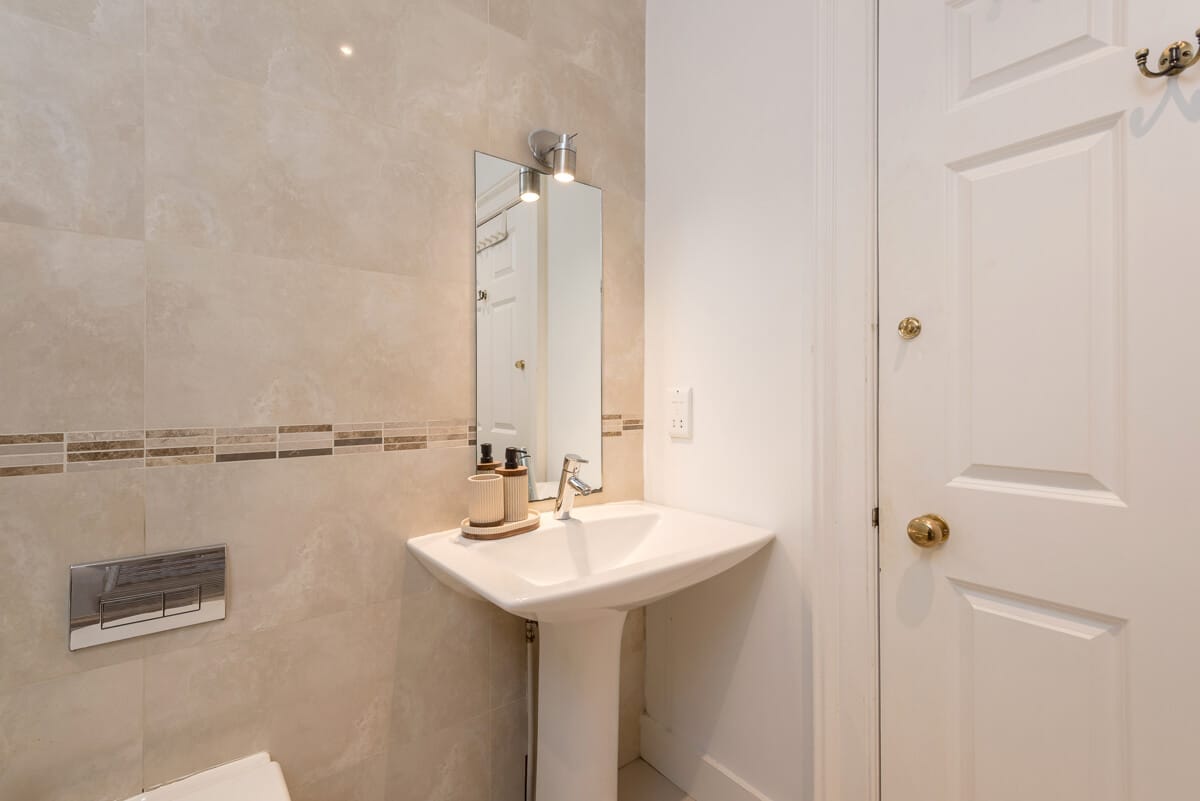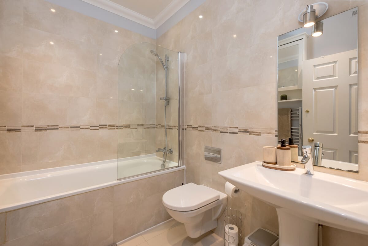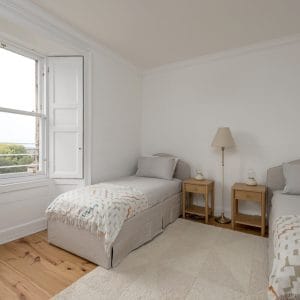 The master bedroom continues the theme of calm sophistication. Here, A king bed promises a restful night’s sleep. Subtle tones of cream and sage create a serene atmosphere, complemented by leafy views from the sash window. The second bedroom features twin single beds, perfect for families or friends sharing the space, designed with the same attention to detail and timeless style.