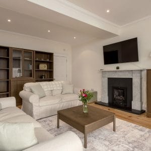 The spacious living room, adorned with soft neutral tones and rich wooden floors, invites you to unwind in style. Large sash windows overlook the rooftops of the New Town, flooding the space with natural light throughout the day. Gather around the coffee table for a relaxed chat or enjoy an evening film on the Smart TV from the comfort of plush sofas. A decorative marble fireplace and thoughtful lighting add a touch of classic refinement to this graceful room.