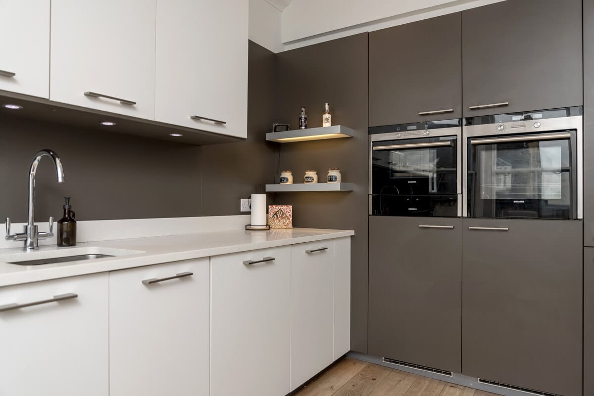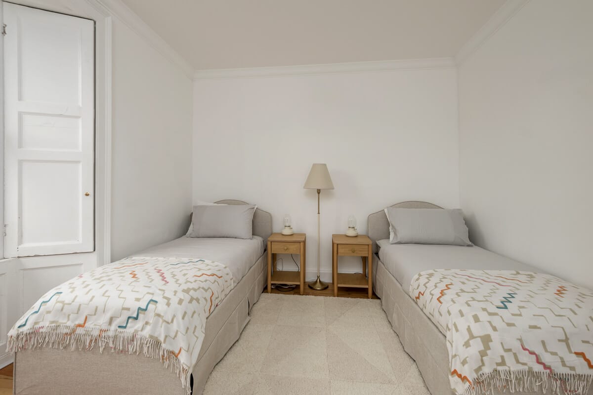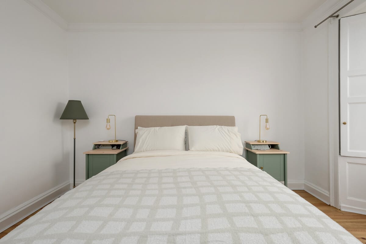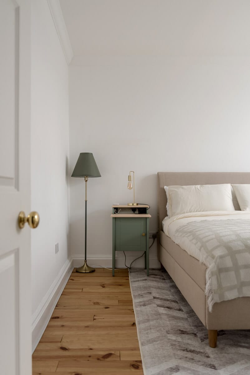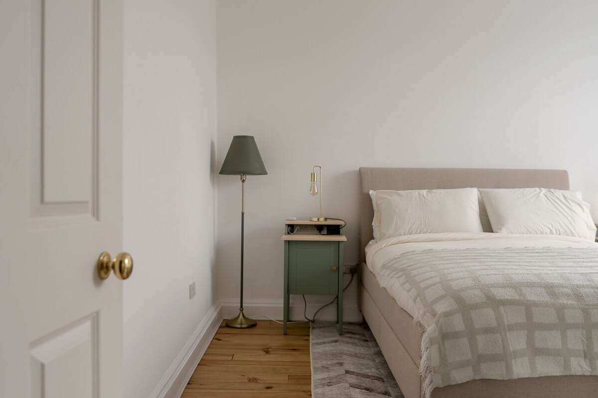 The master bedroom continues the theme of calm sophistication. Here, A king bed promises a restful night’s sleep. Subtle tones of cream and sage create a serene atmosphere, complemented by leafy views from the sash window. The second bedroom features twin single beds, perfect for families or friends sharing the space, designed with the same attention to detail and timeless style.