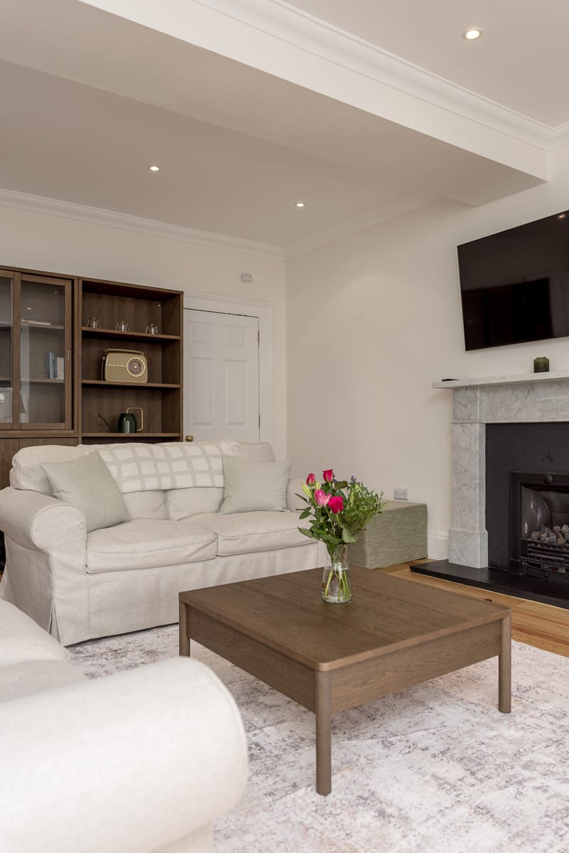 The spacious living room, adorned with soft neutral tones and rich wooden floors, invites you to unwind in style. Large sash windows overlook the rooftops of the New Town, flooding the space with natural light throughout the day. Gather around the coffee table for a relaxed chat or enjoy an evening film on the Smart TV from the comfort of plush sofas. A decorative marble fireplace and thoughtful lighting add a touch of classic refinement to this graceful room.