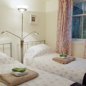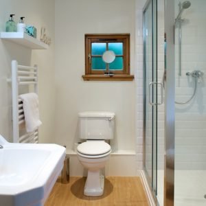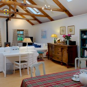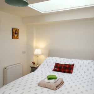 There are two bedrooms inside the cottage, one double and one twin. The double bedroom features a lovely skylight, bedside table, lamp, and mirror, and the twin bedroom is lit by a modern floor lamp. The living room also contains a sofa bed, which can be made up for an additional two guests upon request.