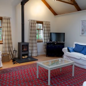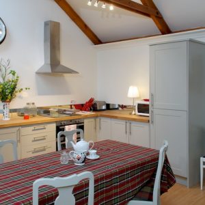 The open plan kitchen/living room is traditionally furnished, with beautiful wood ceiling beams. Cosy tartan curtains, soft throws, and a plush rug add warmth to the space. Pick something to read from the well-stocked bookshelves and relax on one of the comfortable sofas, in front of the woodburning stove and the television.
