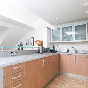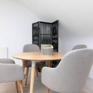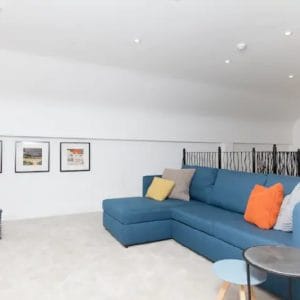 The upper floor of the apartment is a spacious and comfortable living room made up of a cosy sofa and armchair set and wide-screen TV – the perfect set up for winding down after a full-on day of sight seeing! There is additional table seating for four alongside a double sofa-bed that can be made up for an additional guest upon request.